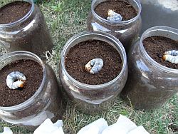 ホームセンターの黒土、ふるいにかけて細かく。 ケース下5cmくらい固く詰めます。水分は適当。。。 その上に以前使った産卵マット(保管してます)を水分調整して固く詰めます。(水分量普通) 仕上げは使用済みの砂埋め霊芝材のかけらを転がして完成です。 だいたいこの時期に越冬中の成虫がお目覚め。。。 ♂♀入れてセット完!割り出しは2ヶ月後。 |